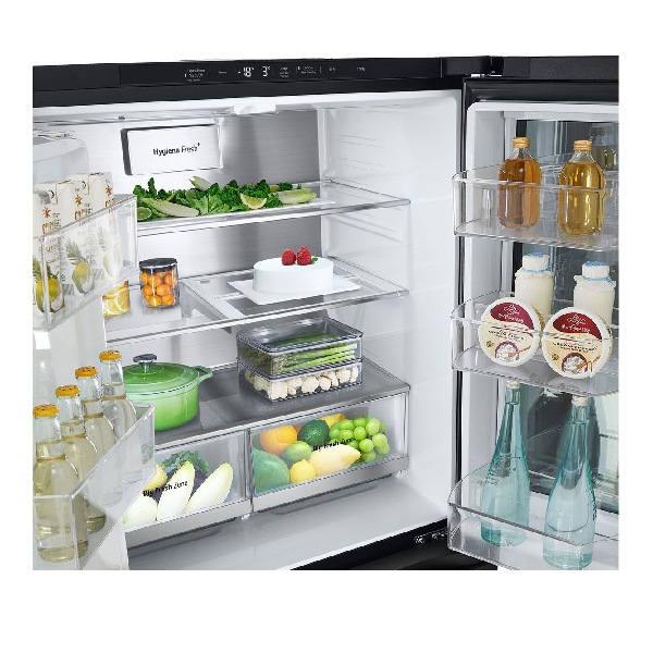 در قسمت یخچال که در بالا قرار دارد 3 عدد قفسه شیشه نشکن وجود دارد. این قفسه ها قابلیت جمع و تا شونده Retractable shelf را دارند و برای قرار دادن ظروف بزرگ مانند بطری، قابلمه و… است. شما میتوانید بسته به نیاز و سلیقه خود با قابلیت تا شدن قفسه و طبقهها انواع موادغذایی را در یخچال جای دهید. همچنین بر روی دو درب ال جی در قسمت چپ و راست 5 عدد طبقه جای دار تا بتوانید اقلام کوچک مانند: سس، مربا، کره، آبلیمو و .... را قرار دهید. دو عدد کشو جا دار هم برای میوه وسبزیجات نیز قرار دارد که قابلیت Big Fresh Zone و Fresh Balancer را دارند تا میوه و سبزیجات طولاتی تر بمانند و تا چند روز همان طراوت و شادابی روز اول را داشته باشند.