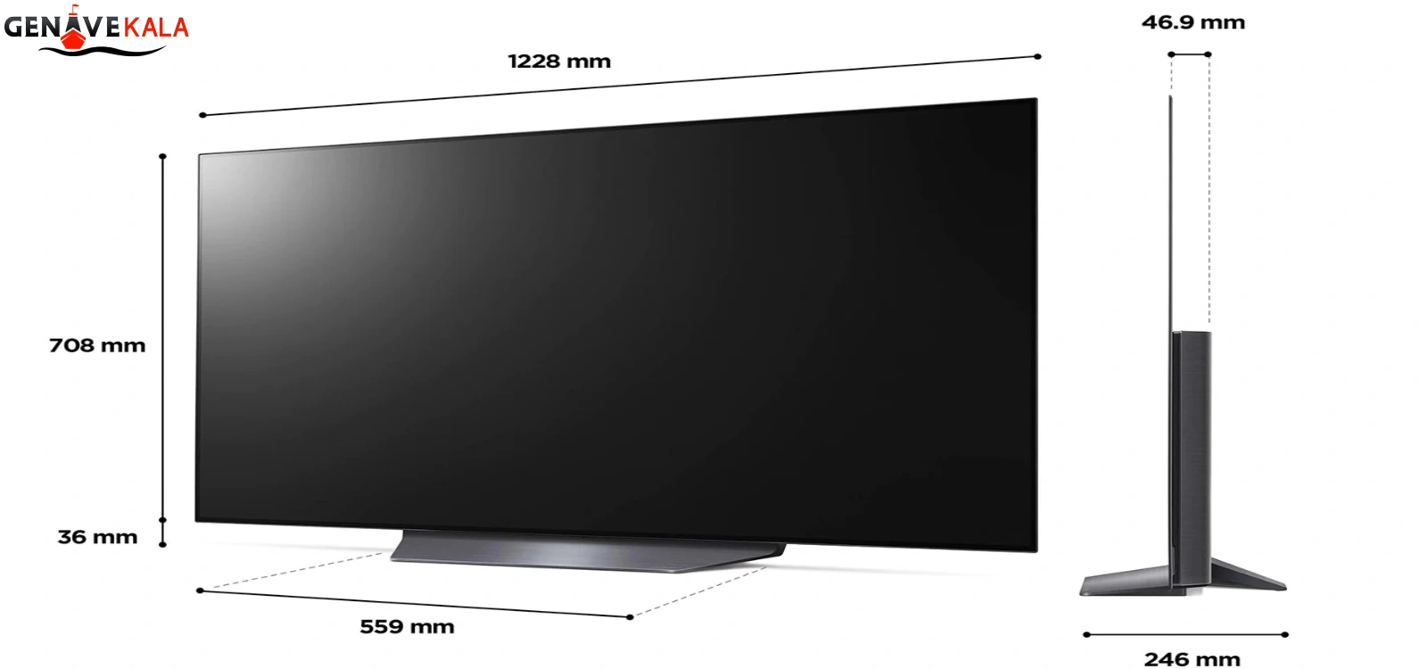 پایه گالری داشبورد Gallery Stand که به راحتی به تلویزیون وصل می شود و شما در هر مکانی که بخواهید می توانید قرار دهید، اما نکته قابل توجه این است که این پایه در بسته بندی قرار ندارد و باید آن را جداگانه خریداری کنید. امکان نصب تلویزیون ال جی بر روی دیوار بسیار آسان است، به راحتی می توانید آن را نصب کنید و در هنگام خاموشی نمایشگر با قابلیت Art Gallery آن را به یک تابلو فوق العاده زیبا تبدیل کنید و عکس دلخواه تان را روی بوم به نمایش بگذارید. 1228*744*246mm ابعاد مدل OLED 55 B2 می باشد.