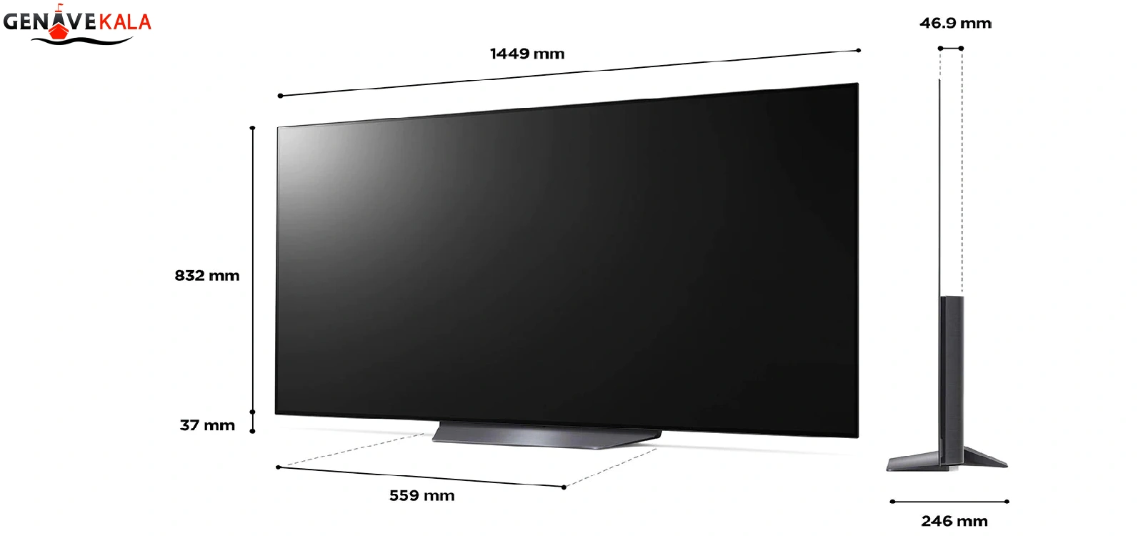 پورت های ارتباطی مانند HDMI و USB، برای اینکه دیده نشوند در پشت تلویزیون قرار گرفته شده اند. وزن آن با پایه 19.9 کیلوگرم می باشد. پایه ی پیوسته و مستطیلی آن که در وسط تلویزیون قرار گرفته، وزن 18.9 کلیو گرمی را تحمل کرده و تعادل را ایجاد می کند. پایه گالری داشبورد Gallery Stand که به راحتی به تلویزیون وصل می شود و شما در هر مکانی که بخواهید می توانید قرار دهید، اما نکته قابل توجه این است که این پایه در بسته بندی قرار ندارد و باید آن را جداگانه خریداری کنید. امکان نصب تلویزیون ال جی بر روی دیوار بسیار آسان است، به راحتی می توانید آن را نصب کنید و در هنگام خاموشی نمایشگر با قابلیت Art Gallery آن را به یک تابلو فوق العاده زیبا تبدیل کنید و عکس دلخواه تان را روی بوم به نمایش بگذارید. 1228*744*246mm ابعاد مدل OLED 77 B2 می باشد.