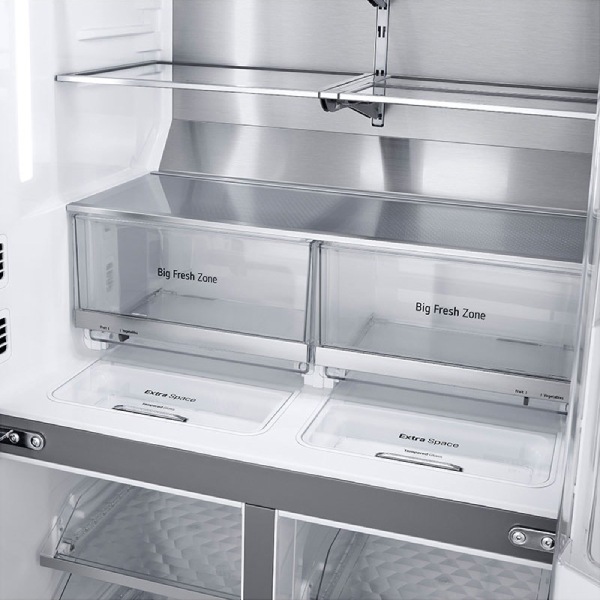 در بخش پایین یخچال، کشوهای Big Fresh Zone به دو محفظه مخفی Extra Space مجهز هستند که برای نگهداری مواد غذایی کوچک مانند پنیر، مربا و تنقلات مناسب است. همچنین، یک طبقه تاشو در قسمت پایین سمت راست یخچال قرار دارد که به شما این امکان را میدهد تا فضای بیشتری برای نگهداری بطریهای بزرگ یا مواد غذایی نیازمند فضای زیاد ایجاد کنید. توجه کنید که لبههای طبقات و کشوها از فلز ساخته شدهاند که علاوه بر زیبایی، باعث بهبود عملکرد سرمایش میشود و از هدر رفت حرارت جلوگیری میکند. همچنین، در قسمت داخلی یخچال از یک صفحه فلزی به نام Metal Fresh استفاده شده که دما را برای مدت طولانی ثابت نگه میدارد.