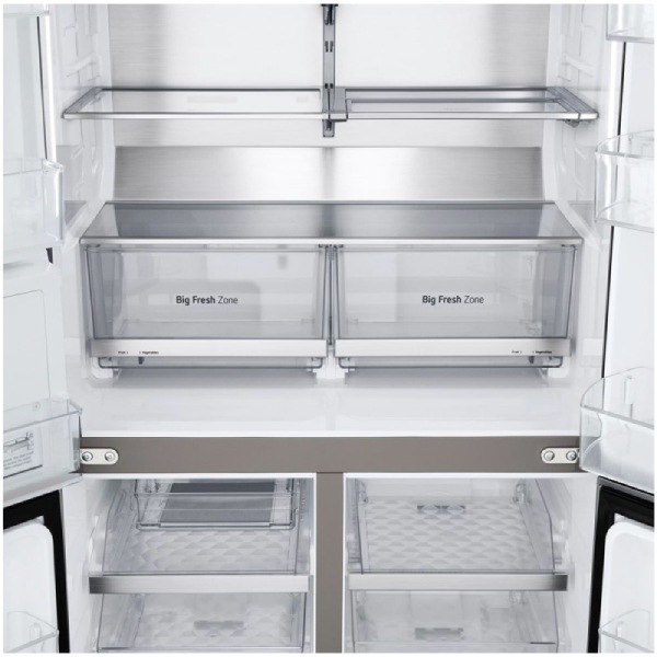 یکی از مهم ترین ملاک ها در هنگام خرید یخچال ظرفیت بوده و آن هم به دلیل این است که آیا می تواند جوابگوی نیاز های یک فرد باشد یا خیر. خوشبختانه یخچال ساید بای ساید ال جی X946 با ظرفیت 705 لیتر یا 32 فوت جوابگو نیاز های 5 نفره و خانواد های پر جمعیت خواهد بود. قسمت یخچال به تنهایی 404 لیتر فضا را به خود اختصاص داده که در ان 3 عدد طبقه شیشه نشکن قرار دارد. این 3 قفسه قابلیت تنظیم ارتفاع Folding shelf را دارند حتی می توانند تا شوند تا دست شما برای چیدمان مواد غذایی باز شود. 2 کشو بزرگ وعمیق زیر قفسهها جاساز شدهاند که برای میوه و سبزیجات به کار میروند و امکان کنترل رطوبت را برای تازه ماندن آنها دارند. همچنین دو جعبه کوچک برای فضای اضافی اختصاص یافتهاند که جلو این کشوها قرار دارند. بر روی درب یخچال 6 عدد طبقه قرار دارد و شما به وسیله آن ها می توانید مواد غذایی کوچک مانند: سس، پنیر، کره، مربا و ....را قرار دهید. قسمت فریزر که کلا در بخش پایین قرار دارد شامل دو عدد درب بوده و ظرفیت آن 301 لیتر می باشد که شامل 4 قفسه جادار و همچنین 2 عدد کشو می باشد. تعداد طبقات روی درب فریزر 6 طبقه می باشد که فضای بیشتری را در اختیار شما قرار می دهد.