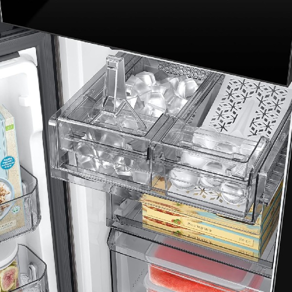یکی از نکات جذاب در طراحی این یخچال فریزر، دستگیرههای توکار و مخفی است که به باز و بسته کردن دربها سرعت و سهولت میبخشد. علاوه بر انکه دستیگره های توکار و مخفی دارد دارای یک دکمه لمسی است که با لمس آن درب های یخچال به صورت خودکار باز و بسته می شوند. در این مدل، صفحه نمایش LED و سیستم آبریز و یخریز به صورت مخفی در داخل یخچال قرار گرفتهاند که به زیبایی و نظم داخلی یخچال افزوده و از شلوغی ظاهری آن جلوگیری میکنند.