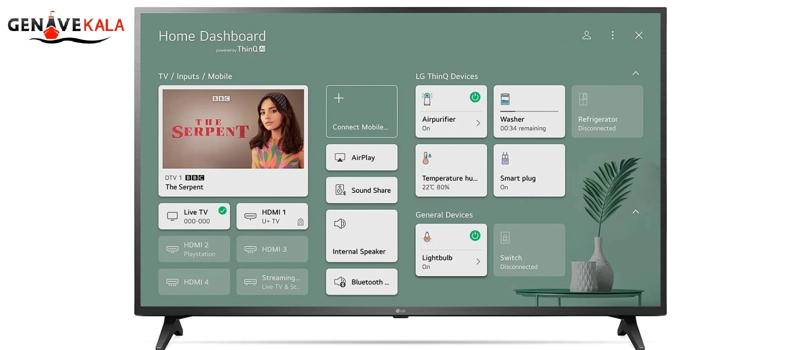 شما کاربران گرامی می توانید با استفاده از قابلیت FILMMAKER MODE در تلویزیون LG، سینما را به خانه خود بیاورید و لحظاتی را در هنگام تماشای فیلم تجربه کنید که بسیار هیجان انگیز و در عین حال لذت بخش است. قابلیت های اتصال این محصول، از قبیل 2 پورت HDMI و 1 پورت USB می باشد. از امکانات هوشمند دیگر این تلویزیون می توان به ریموت کنترل آن اشاره کرد که می توان در زمینه جستجوی صوتی از آن بهره مند شد. قابلیت هوش مصنوعی ال جی با نام ThinQ در این محصول وجود دارد که در توضیحات بعدی و در جدا سازی ویژگی ها، به بررسی کامل این قابلیت نیز خواهیم پرداخت.