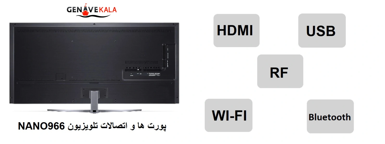 پورت ها و اتصالات این تلویزیون به نحوی حرفه ای و عالی در قسمت پشت تلویزیون برای جلوگیری از ایجاد شلوغی در ظاهر تلویزیون طراحی شده اند. تعداد پورت ها بسیار بیشتر از حد نیاز است و این مزیت می تواند بسیار مهم محسوب شود. دسترسی به پورت ها یا ورودی های تلویزیون ال جی نانوسل 75NANO966 بسیار راحت است و استفاده همزمان از 4 پورت HDMI و 3 پورت USB برای شما فراهم شده است. راه های ارتباطی تلویزیون شامل WiFi، Bluetooth و موبایل می شود که می توانید تلویزیون هوشمند ال جی را به هر یک از این موارد گفته شده به آسانی متصل کنید و از قابلیت ها و امکانات موجود در این بخش استفاده کنید.
